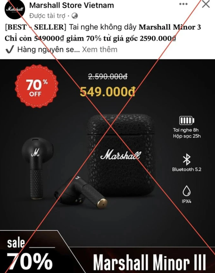Ngoài ra, trên Facebook liên tục xuất hiện các quảng cáo được tài trợ về chiếc tai nghe Marshall Minor 3, loa giả mạo giá chỉ 549.000 đồng, giảm 70% từ giá gốc 2.890.000 đồng.
