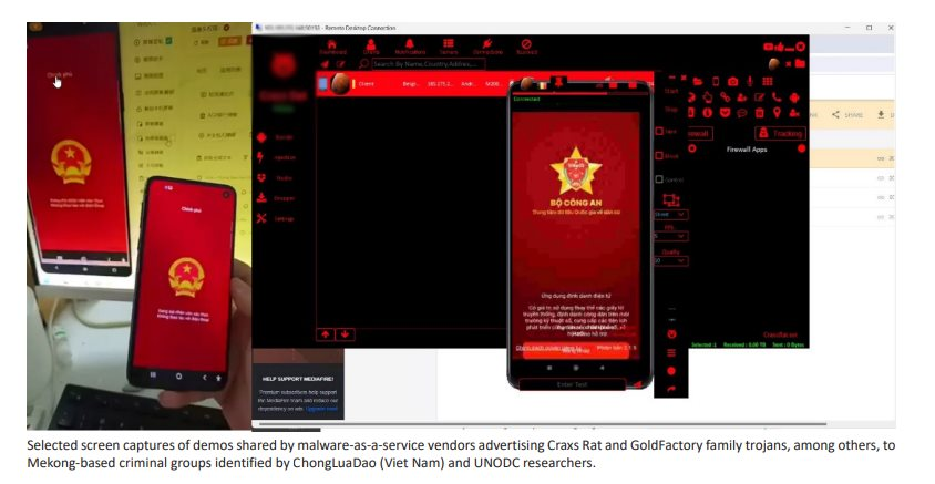 Báo cáo cũng nhấn mạnh những thông tin đáng báo động về một loại vi-rút Trojan truy cập từ xa tùy chỉnh (RAT) malware nhắm đến nạn nhân tại Việt Nam, Thái Lan, và một số quốc gia châu Á khác thông qua các ứng dụng di động giả mạo các app dịch vụ công như VNEID, VSSID, Tổng cục thuế...