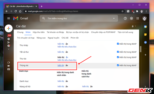 Trường hợp nếu không thấy lựa chọn Thùng rác, bạn hãy truy cập vào trang cài đặt Gmail, nhấn vào tab "Nhãn", tìm và nhấn vào lựa chọn "hiển thị" ở dòng "Thùng rác".