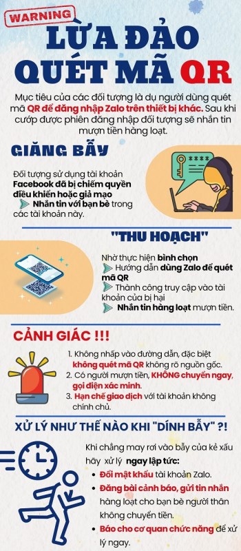 Cơ quan Công an đề nghị người dân cảnh giác, không truy cập vào đường link sau khi thấy mã QR có trên thông báo. Nếu rơi vào bẫy, người dân cần lập tức đổi mật khẩu Zalo, đăng bài cảnh báo người thân, bạn bè rằng tài khoản đã bị chiếm quyền và tuyệt đối không chuyển tiền theo yêu cầu của kẻ lừa đảo.