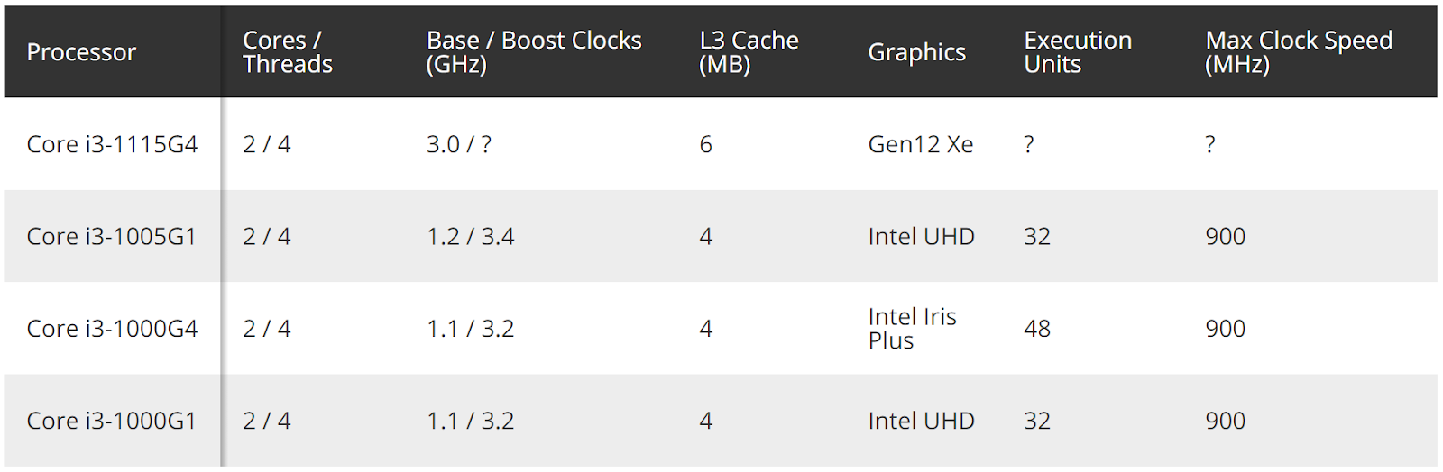 Theo kết quả trên SiSoftware thì Core i3-1115G4 được cho là có xung nhịp cơ bản đạt 3 GHz, cao hơn gấp rưỡi so với Core i3-1005G1, còn xung nhịp boost thì vẫn chưa rõ là có được cải thiện hay không, và nếu có thì là bao nhiêu phần trăm.