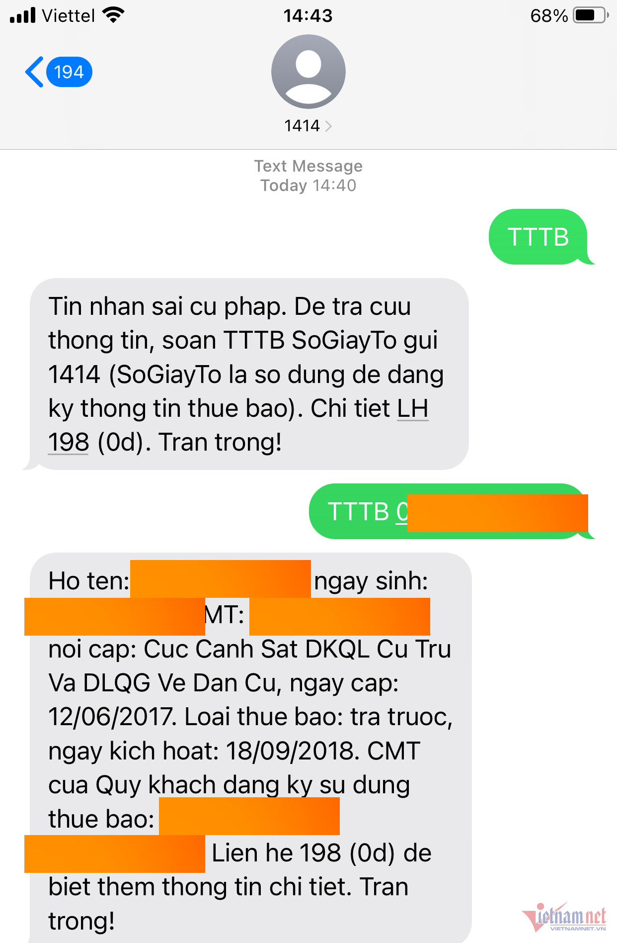 Khi tin nhắn kiểm tra thông tin thuê bao gửi đến 1414 đúng cú pháp, thông tin trả về sẽ bao gồm: Họ tên chủ sở hữu thuê bao; ngày sinh; số giấy tờ (CCCD, CMT hoặc hộ chiếu) kèm nơi cấp, ngày cấp; loại thuê bao; ngày hoà mạng,...
