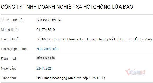 Theo thông tin VietNamNet mới nhận được, cựu hacker Ngô Minh Hiếu mới đây đã thành lập một đơn vị pháp nhân là Công ty TNHH doanh nghiệp xã hội Chống lừa đảo (Công ty Chống lừa đảo).