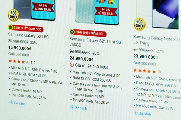 Điều chỉnh nhẹ hơn một chút là dòng máy Galaxy S21 Ultra 5G. Phiên bản 128GB của máy đang được bán với giá 21,99 triệu, giảm 9 triệu đồng, khoảng 29% giá trị máy. Với Galaxy S21 Ultra 5G bản 256GB, máy hiện được bán với giá 24,99 triệu, giảm 9 triệu đồng.