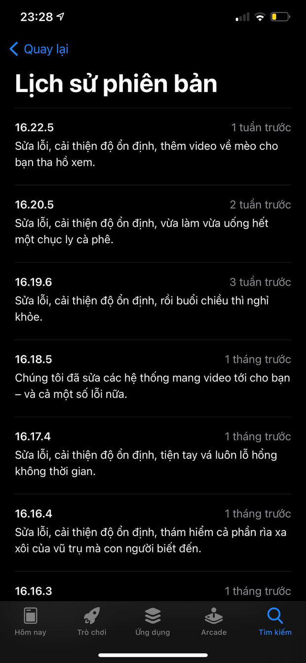 Không chỉ vậy, khi bấm vào Lịch sử phiên bản lại càng thú vị hơn với rất nhiều lời giới thiệu đầy hài hước như "vừa làm vừa uống hết một chục ly cà phê", "vá lỗ hổng thời gian"...