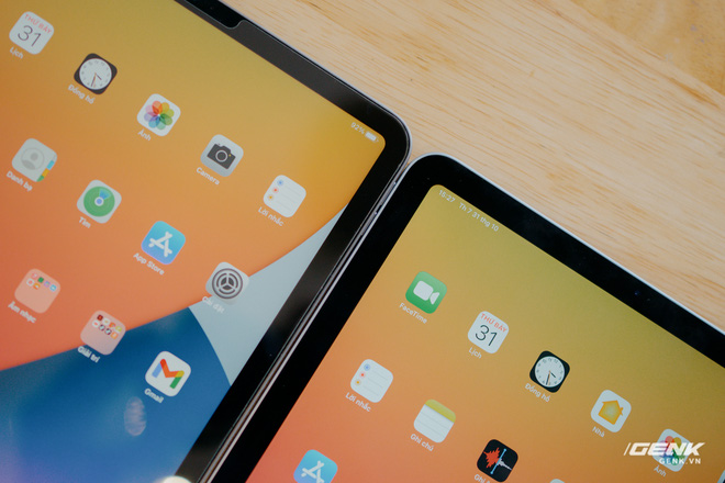 Dù thiết kế thoạt nhìn có vẻ rất giống nhau, tuy nhiên thực tế màn hình của iPad Air 4 bị cắt giảm khá nhiều yếu tố so với iPad Pro, ví dụ như kích thước bé hơn 0.1 inch (10.9 inch so với 11 inch), viền dày hơn và độ sáng thấp hơn đôi chút.