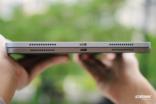 Tương tự như vậy, nếu chỉ nhìn bên ngoài, hệ thống loa của iPad Air 4 và iPad Pro rất giống nhau với 4 lỗ khoét ở 2 cạnh bên, tạo cho người dùng cảm giác rằng iPad Air 4 có 4 loa như iPad Pro. Thực tế, iPad Air 4 chỉ có 2 loa, và 2 trong số 4 lỗ khoét chỉ mang mục đích... trang trí. Chính vì vậy, iPad Air 4 cho chất lượng âm thanh kém hơn so với iPad Pro, bao gồm cả âm bass và treble.