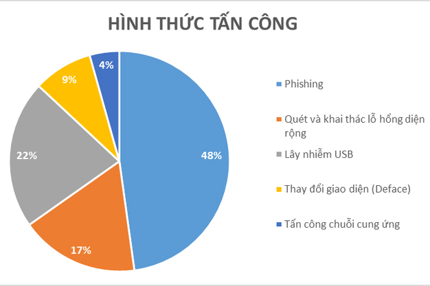 Thống kê của Cục An ninh mạng và phòng, chống tội phạm sử dụng công nghệ cao, Bộ Công an cho thấy một số phương thức, thủ đoạn tấn công phổ biến nhất hiện nay là: Câu nhử (Phishing); khai thác lỗ hổng bảo mật trên diện rộng (mass scan, mass exploit); tấn công thông qua thiết bị USB, tấn công thay đổi giao diện.