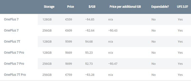 Mặc dù OnePlus 7T không còn trên các kệ hàng, nhưng người dùng cũng chỉ mất thêm có… 30 USD để nâng gấp đôi dung lượng lưu trữ trên chiếc OnePlus 7 Pro từ 128GB lên 256GB, chưa kể lại có thêm 2GB RAM nữa. Khó có hãng nào khác có thể "địch" lại được thành tích này.