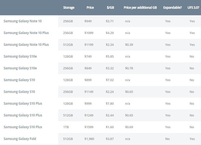 Thứ hạng này của Samsung chủ yếu đến từ hai phiên bản bộ nhớ trong "khổng lồ" là 512GB và 1TB; đồng thời, một điểm cộng nữa là Samsung hỗ trợ bộ nhớ mở rộng qua khe cắm thẻ nhớ trên mọi thiết bị di động của mình (ngoại trừ Galaxy Fold). Trên Note 10 và flagship màn hình gập, Samsung còn hỗ trợ chuẩn bộ nhớ UFS 3.0 nữa.