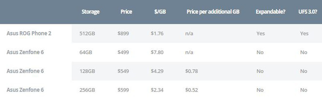 Không thể không nhắc đến mẫu điện thoại ROG Phone 2; "con quái vật" chuyên về chơi game này có dung lượng bộ nhớ 512GB xếp thứ hai trong danh sách tính theo tỉ lệ giá thành và dung lượng bộ nhớ; tuy nhiên xếp trên nó lại chỉ là một "con quái vật" về bộ nhớ khác – mẫu Samsung Galaxy S10 Plus 1TB có dung lượng bộ nhớ khá "điên rồ" với một chiếc smartphone – có mức giá cao gấp đôi là 1.499 USD.