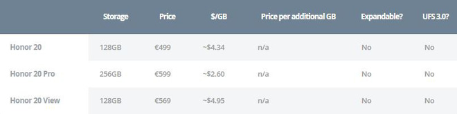 Có sự khác biệt lớn giữa ba hãng "xếp đáy" bảng xếp hạng, nhưng Honor – đứng ở vị trí thứ 4 – vẫn xứng đáng được ca ngợi vì đã gần như đứng đầu bảng xếp hạng giá thành trên mỗi GB dung lượng với mức giá trung bình các dòng flagship năm 2019 của hãng này chỉ 3,96 USD mỗi GB (thấp hơn so với 0,06 sau OnePlus). Đáng chú ý nhất là chiếc Honor 20 Pro, bộ nhớ trong tiêu chuẩn 256GB mà giá chỉ 667 USD.
