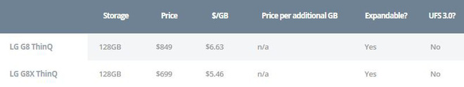 Lưu ý rằng trong bảng xếp hạng này, dòng điện thoại V50 không được tính bởi chúng là những mẫu điện thoại hỗ trợ 5G, nhưng ngay cả với những mẫu điện thoại cao cấp này, LG vẫn giữ nguyên công thức "128GB + khe cắm thẻ nhớ MicroSD" vốn đã chứng minh được tính hiệu quả của mình.