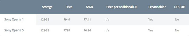 Tuy nhiên, điều không may là nếu muốn mở rộng bộ nhớ trên điện thoại Sony, bạn sẽ chỉ có lựa chọn duy nhất là thẻ nhớ ngoài. Bởi ở thời điểm hiện tại, Sony không bán điện thoại nào có bộ nhớ trong trên 128GB và không có bất kỳ dấu hiệu nào cho thấy hãng sẽ tăng dung lượng bộ nhớ của chiếc máy này. Cả Xperia 1 và Xperia 5 đều không lọt vào top 10, nhưng nếu cộng gộp rồi chia trung bình, thì mức giá trung bình trên mỗi GB bộ nhớ lưu trữ của Sony chỉ đứng sau Apple.