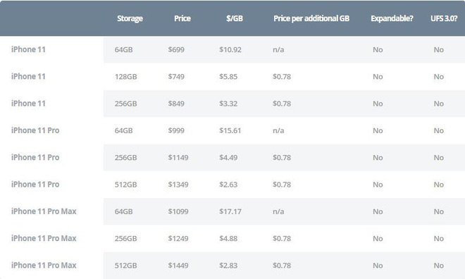 Điều đáng ngạc nhiên là, gã khổng lồ công nghệ xứ Cupertino lẽ ra có thể có được thứ hạng thấp hơn trong bảng xếp hạng này nhưng vì một vấn đề nhỏ mà họ không thể có được vị trí ấy: chỉ là do phiên bản iPhone 64GB có mức giá quá đắt đỏ. iPhone 11 – chiếc iPhone bản "tiêu chuẩn" của năm nay có giá khởi điểm từ 999 USD cho phiên bản có dung lượng bộ nhớ thấp nhất, trong khi đó iPhone 11 Pro Max có giá khởi điểm là 1.099 USD. Điều này khiến Apple trở thành một trong những hãng điện thoại có tỉ lệ giá bán trên mỗi GB dung lượng lưu trữ đắt đỏ nhất trong ngành công nghiệp.