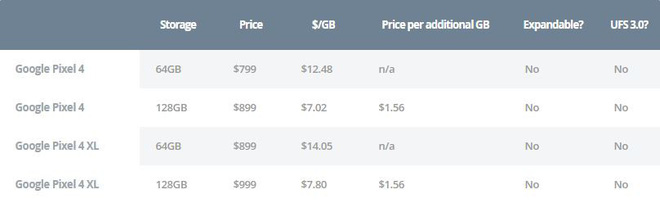 Với chiếc điện thoại flagship của Google, sự chênh lệch về giá giữa hai tùy chọn bộ nhớ trong lên đến 1,56 USD cho mỗi GB cộng thêm, gần gấp đôi so với hãng xếp thứ hai và gấp hơn 3 lần so với hãng xếp cuối danh sách về tiêu chí này. Để so sánh, theo các báo cáo, năm 2019 trung bình mỗi GB dung lượng lưu trữ chỉ có giá khoảng 0,08 USD mà thôi. Như vậy, Google có thể thu lãi ròng lên đến 95 USD với mỗi chiếc Pixel 4 hoặc Pixel 4 XL 128GB được bán ra.