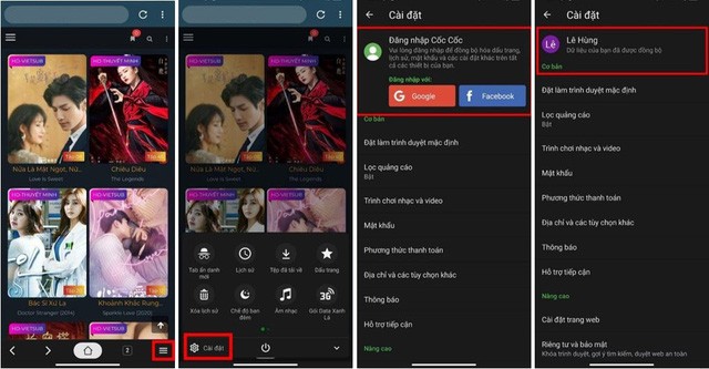 Bấm dấu 3 gạch ngang ở thanh công cụ bên dưới màn hình -> Bạn sẽ thấy mục đăng nhập với Cốc Cốc (tại đây, Cốc Cốc cho phép bạn kết nối bằng tài khoản Google hoặc Facebook) -> Chọn đăng nhập thông 1 trong 2 nền tảng Google hoặc Facebook là xong.