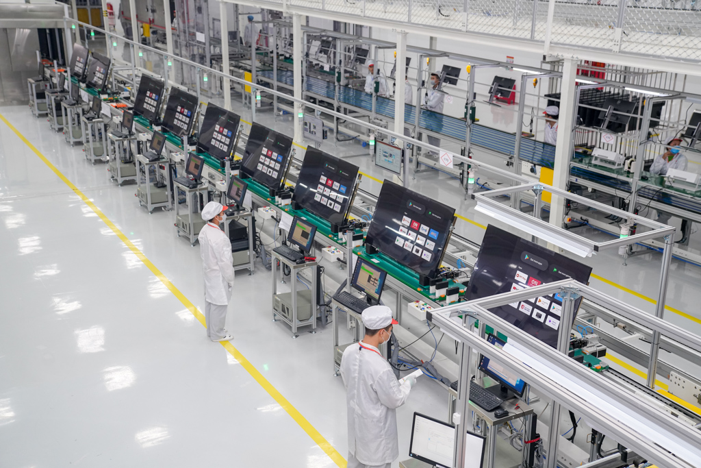 Dây chuyền sản xuất tivi chia thành 3 phân khu chính: khu sản xuất cụm màn hình LCM, khu lắp ráp thành phần, test chức năng của tivi và cuối cùng là khu đóng gói.