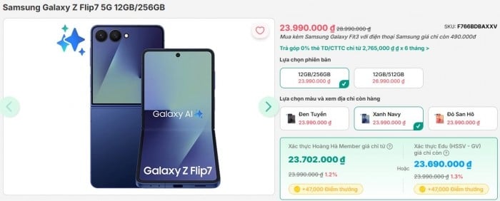 Không những vậy, giá bán Galaxy Z Flip7 còn đang được ưu đãi giảm mạnh, ở mức 23.99 triệu đồng cho mẫu 256GB và 26.99 triệu đồng cho mẫu 512GB, vẫn rẻ hơn iPhone 17 gần 4 triệu đồng.