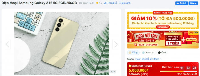 Ra mắt với giá gần 7 triệu đồng, cuối tháng 12, Galaxy A16 5G đang được siêu sale sập sàn với giá chỉ 5 triệu đồng, biến nó trở thành chiếc smartphone hấp dẫn dễ tiếp cận.