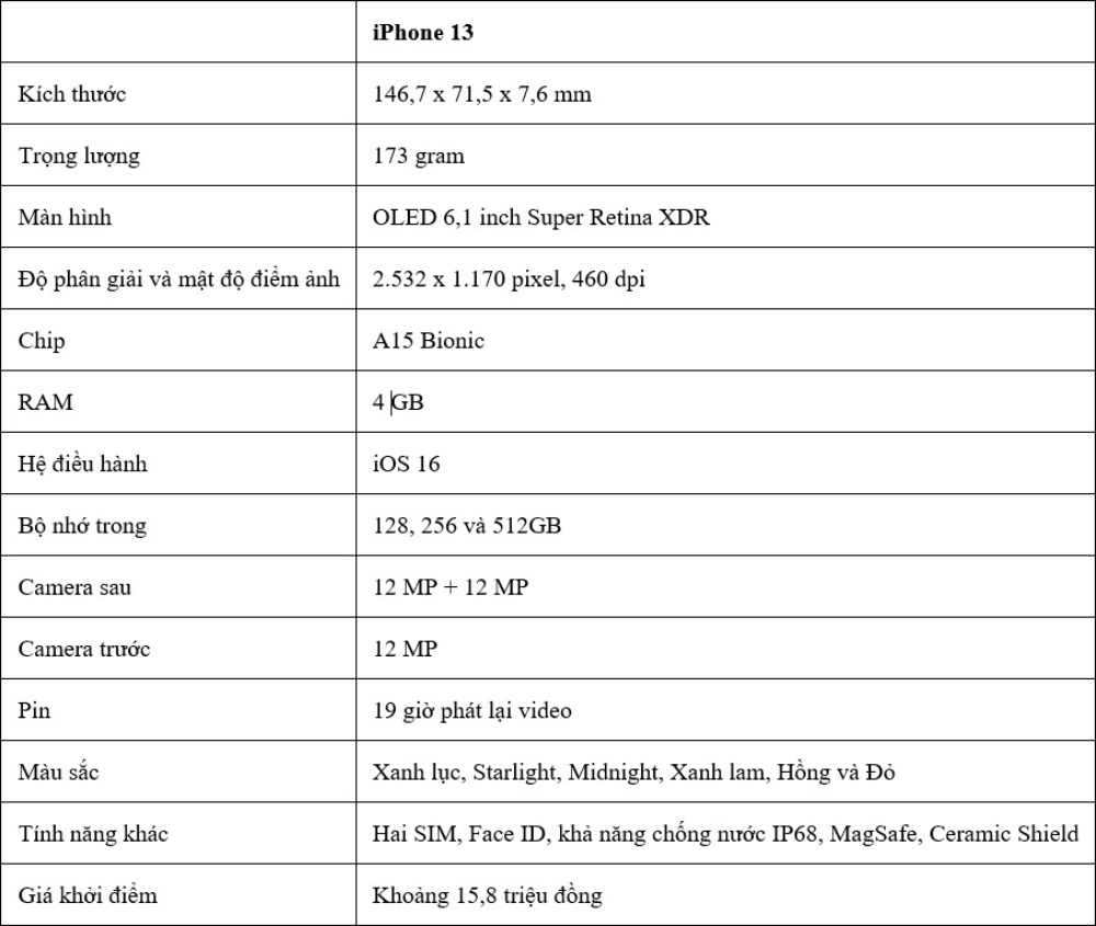 Khi xem xét thông số kỹ thuật, iPhone 13 đáp ứng rất nhiều kỳ vọng của người dùng nhờ nhiều tính năng cao cấp. Điều này có thể kể đến như màn hình XDR OLED 5,1 inch và chip A15 Bionic mạnh mẽ, đi kèm RAM 4 GB. Ở mặt sau điện thoại có camera kép cùng thời lượng pin cho khả năng phát video kéo dài đến 19 giờ. Chưa dừng lại, điện thoại cũng có khả năng chống nước, sạc không dây hoặc MagSafe. Ở mức giá kể trên, thật khó để tìm kiếm một sản phẩm có tất cả các chức năng như vậy./.