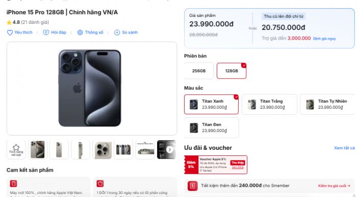 Với trang bị khung Titan cao cấp hơn iPhone 17 Pro Max, giá rẻ dễ tiếp cận kèm phần cứng cực kỳ xuất sắc vào tháng 3/2026, iPhone 15 Pro vẫn cực kỳ đáng mua nếu bạn đang tìm kiếm một chiếc iPhone Pro mới với giá rẻ nhất tại Việt Nam.