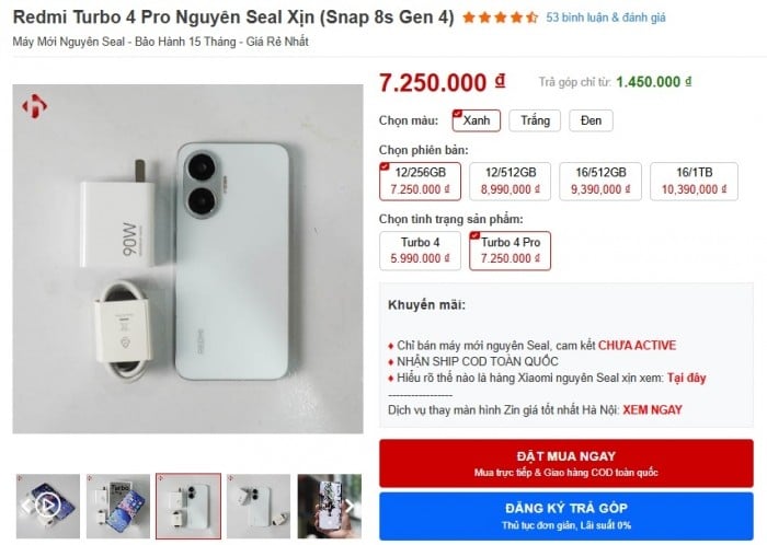 - Redmi Turbo 4 Pro - 12/256: 7.25 triệu đồng;