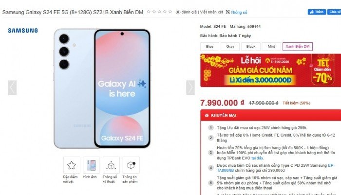 Nếu định mua máy mới trước Tết, Galaxy S24 FE đang giảm thấp kỷ lục khi chỉ hơn 7.9 triệu đồng đã có thể sở hữu bản tiêu chuẩn 128GB.