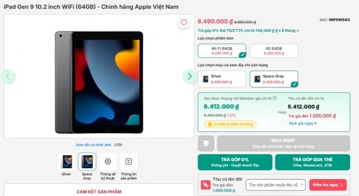 Tại thời điểm tháng 12, iPad Gen 9 rẻ nhất hiện chỉ khoảng 6.49 triệu đồng cho bản 64GB Wifi trong khi bản thêm kết nối không dây 4G từ 9.9 triệu đồng. Có thể thấy iPad Gen 9 hiện chỉ bằng một chiếc smartphone giá rẻ và tầm trung cơ bản. Dù rẻ như bèo nhưng chiếc iPad này vẫn có thể cân tốt mọi tác vụ cơ bản thậm chí là chơi game, học tập.