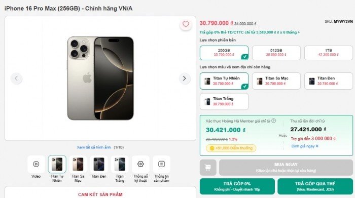 - iPhone 16 Pro Max 256GB: 30.79 triệu đồng;