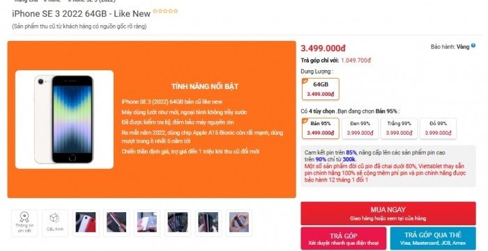 Tại Việt Nam, nhiều đại lý cuối tháng 3 vẫn bán iPhone SE 3 cũ với ngoại hình đẹp như mới chỉ từ 3.49 triệu đồng mức giá ngang với những mẫu máy Android giá rẻ nhất thị trường. Dù rẻ nhưng iPhone SE 3 lại sở hữu phần cứng đặc biệt là chip vẫn rất mạnh thậm chí ngang ngửa iPhone 17e mới.