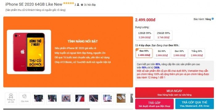 Cận Tết, iPhone SE 2020 có giá chưa đầy 3 triệu đồng cho bản tiêu chuẩn 64GB. Trong khi đó dung lượng cao hơn cũng không đắt hơn nhiều khi cũng chỉ hơn 3 triệu. Ở mức giá này nếu mua smartphone khác sẽ khó lòng có được chip mạnh và camera chất lượng hơn iPhone SE 2020.