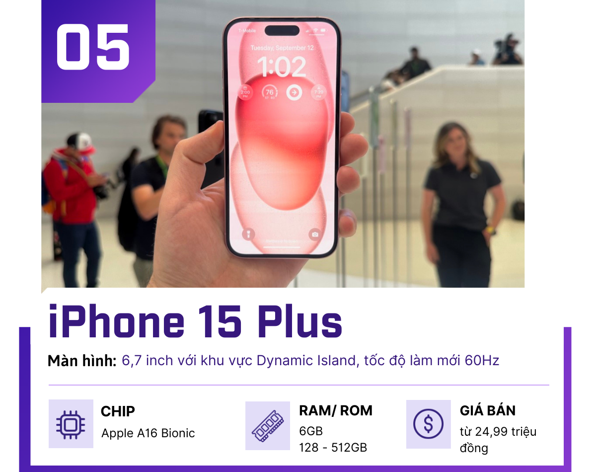 Tuy nhiên, iPhone 15 Plus chỉ có màn hình với tốc độ làm mới 60Hz, không mượt mà như nhiều smartphone khác trong danh sách này. Bù lại, viên pin 4383 mAh có thể đảm bảo sử dụng trong cả ngày dài. Camera chính 48MP + camera góc siêu rộng 12MP hứa hẹn đem lại cho người dùng ảnh chụp cực "chất".