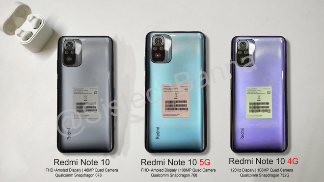 Về cấu hình phần cứng, Redmi Note 10 có 3 phiên bản với 3 tùy chọn cấu hình khác nhau, trong đó bản tiêu chuẩn sẽ được trang bị con chip Snapdragon 678 và camera 48MP, còn bản 5G thì trang bị con chip Snapdragon 768 với camera 108MP. Ngoài ra, còn có thêm 1 phiên bản 4G chạy chip Snapdragon 732G, camera 108MP và có màn hình 120Hz. Hiện chưa rõ mức giá của 3 phiên bản này.