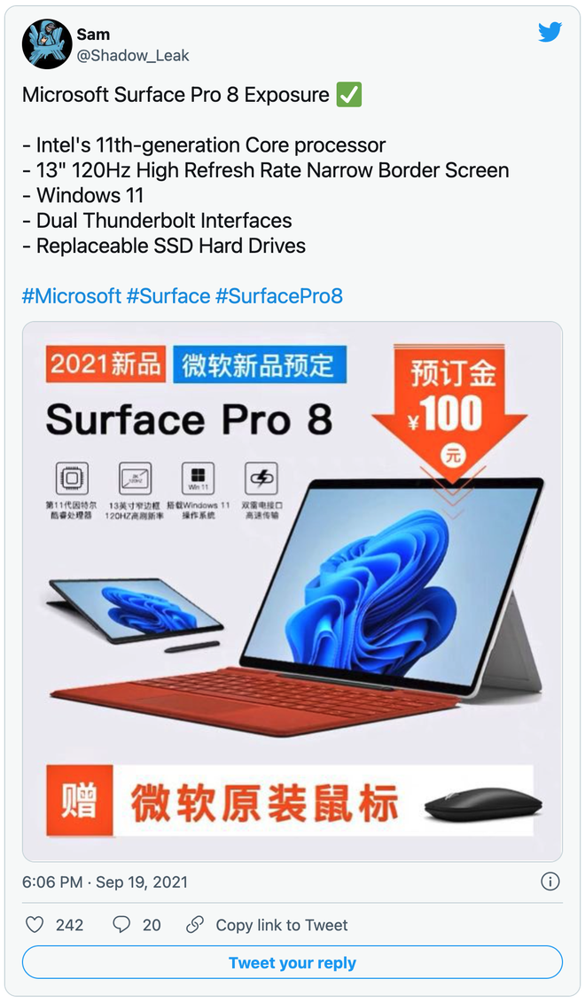 Cụ thể, tài khoản Shadow_Leak cho biết Surface Pro 8 sẽ được trang bị màn hình 13 inch tần số quét 120Hz mới, với viền mỏng hơn và có hai cổng Thunderbolt.