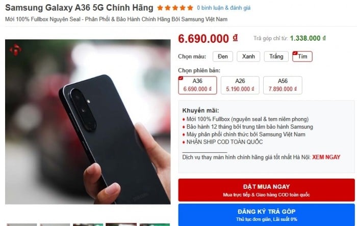 Tại thời điểm tháng 12, giá Galaxy A36 5G thấp nhất ghi nhận chỉ từ 6.69 triệu đồng. Tuy vẫn nằm trong phân khúc tầm trung nhưng đây là một trong những lựa chọn rẻ nhất mà bạn có thể cân nhắc về smartphone vừa có màn lớn và chip hiệu năng mạnh.