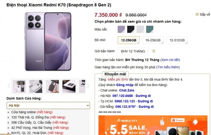 Ngay khi đã bước sang tháng 5, khi mà đã có Redmi K80 thì Redmi K70 vẫn có hàng nhiều tại Việt Nam dưới dạng xách tay với giá hiện chỉ khoảng 8 triệu đồng với hàng mới đập hộp.