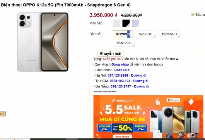 Cụ thể, trong tháng 5, khách Việt có thể đập hộp OPPO K12s với giá thấp nhất chỉ từ 3.89 triệu đồng với bản tiêu chuẩn 8/128GB. Trong khi đó các bản dung lượng cao hơn đắt hơn không nhiều: