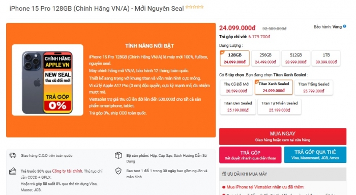 Theo đó, iPhone 15 Pro hiện vẫn có hàng mới đập hộp với giá chỉ từ 24.09 triệu đồng cho bản 128GB. Bản 256GB có giá khoảng 27.69 triệu đồng. Mức giá rẻ kỷ lục này khiến nó trở thành chiếc iPhone Titan rẻ nhất tại Việt Nam.
