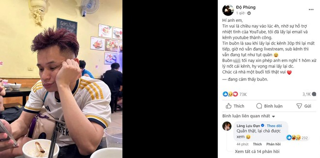 Thông tin nam streamer bị hack kênh YouTube có lượng theo dõi hàng đầu Việt Nam lập tức trở thành chủ đề được quan tâm. Mới đây, Độ Mixi cũng chia sẻ tình hình kênh YouTube cá nhân của mình. Anh cho biết mình đã được hỗ trợ lấy lại kênh vào lúc 4h chiều, tuy nhiên chỉ sau đó 30 phút kênh lại bị hacker chiếm dụng.