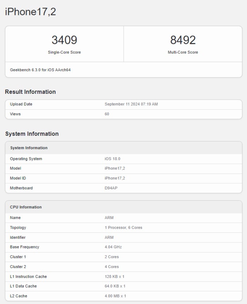 Trong hình ảnh hiển thị có thể nhận thấy rằng cấu hình CPU và tốc độ xung nhịp 4,04 GHz giống với danh sách Geekbench 6 trước đó, nhưng có một điểm khác biệt nhỏ. Lần cuối cùng A18 được thử nghiệm được chạy trên một thiết bị có số hiệu iPhone17,3. Lần này, điện thoại được đề cập là iPhone 17,2. Hiện không thể xác định được mẫu nào đã được thử nghiệm, vì vậy tất cả cần thêm thời gian.