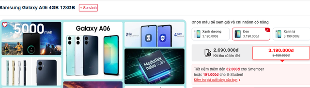 Hiện tại, A06 đang có mức giá vô cùng hấp dẫn, chỉ 3,19 triệu đồng.
