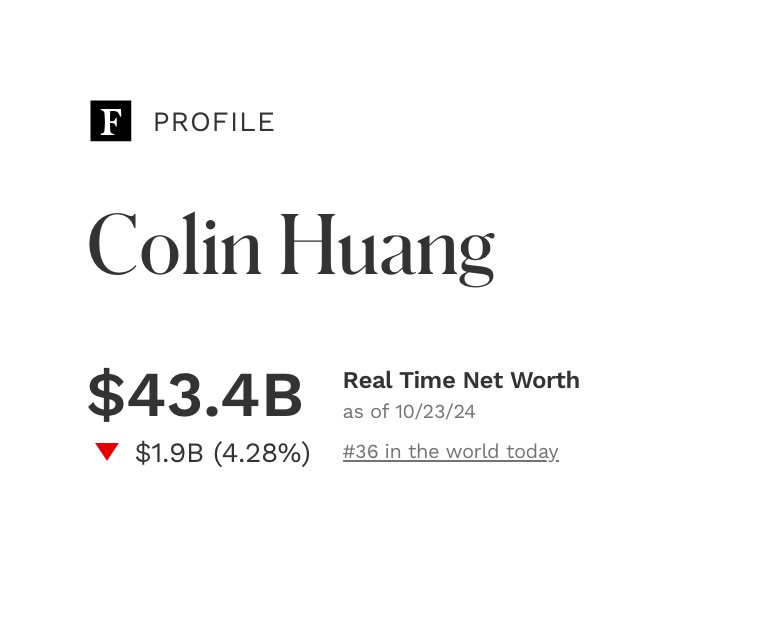 Sự tăng trưởng của PDD đẩy khối tài sản của nhà sáng lập Colin Huang (43 tuổi) lên 43,4 tỷ USD, đứng thứ 36 trong danh sách tỷ phú thế giới và là người giàu thứ 4 Trung Quốc, theo Forbes. Cuối năm ngoái, nhà sáng lập PDD còn là người giàu thứ 2 Trung Quốc với khối tài sản lên đến hơn 54 tỷ USD. Cũng trong danh sách này của Forbes, tỷ phú Phạm Nhật Vượng của Việt Nam đang xếp thứ 829 với khối tài sản ước tính hơn 4,2 tỷ USD.