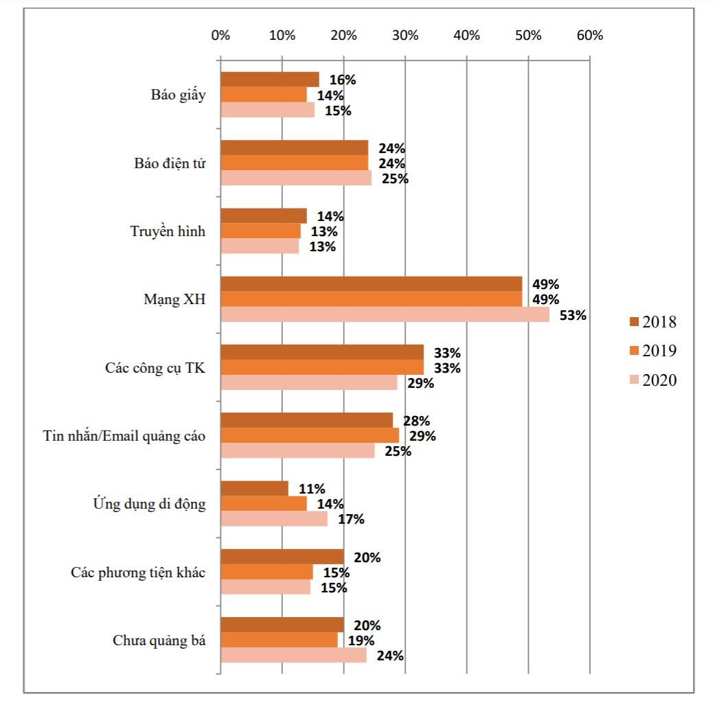 Quảng cáo trên báo giấy và báo điện tử đã nhích tăng so với 2019 dù không đáng kể với tỷ lệ lần lượt là 14% và 15%. Trong khi truyền hình giảm nhẹ với tỷ lệ 13%. Đặc biệt có tới 24% doanh nghiệp tham gia khảo sát cho biết, chưa sử dụng hình thức quảng cáo trực tuyến nào.