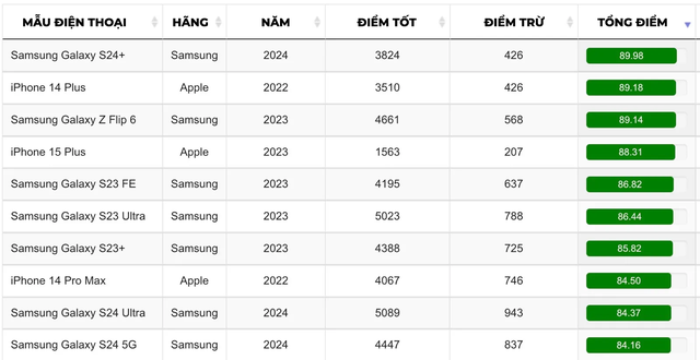 Kết quả khá bất ngờ. Samsung Galaxy S24 Plus đứng đầu danh sách, theo sau là iPhone 14 Plus. Galaxy Z Flip 6 đứng ở vị trí thứ ba. Mặc dù người dùng yêu thích Flip 6 là điều dễ hiểu, nhưng có một lỗi ở đây: Samsung chỉ mới ra mắt chiếc điện thoại gập này vài tháng trước, không phải vào năm 2023.