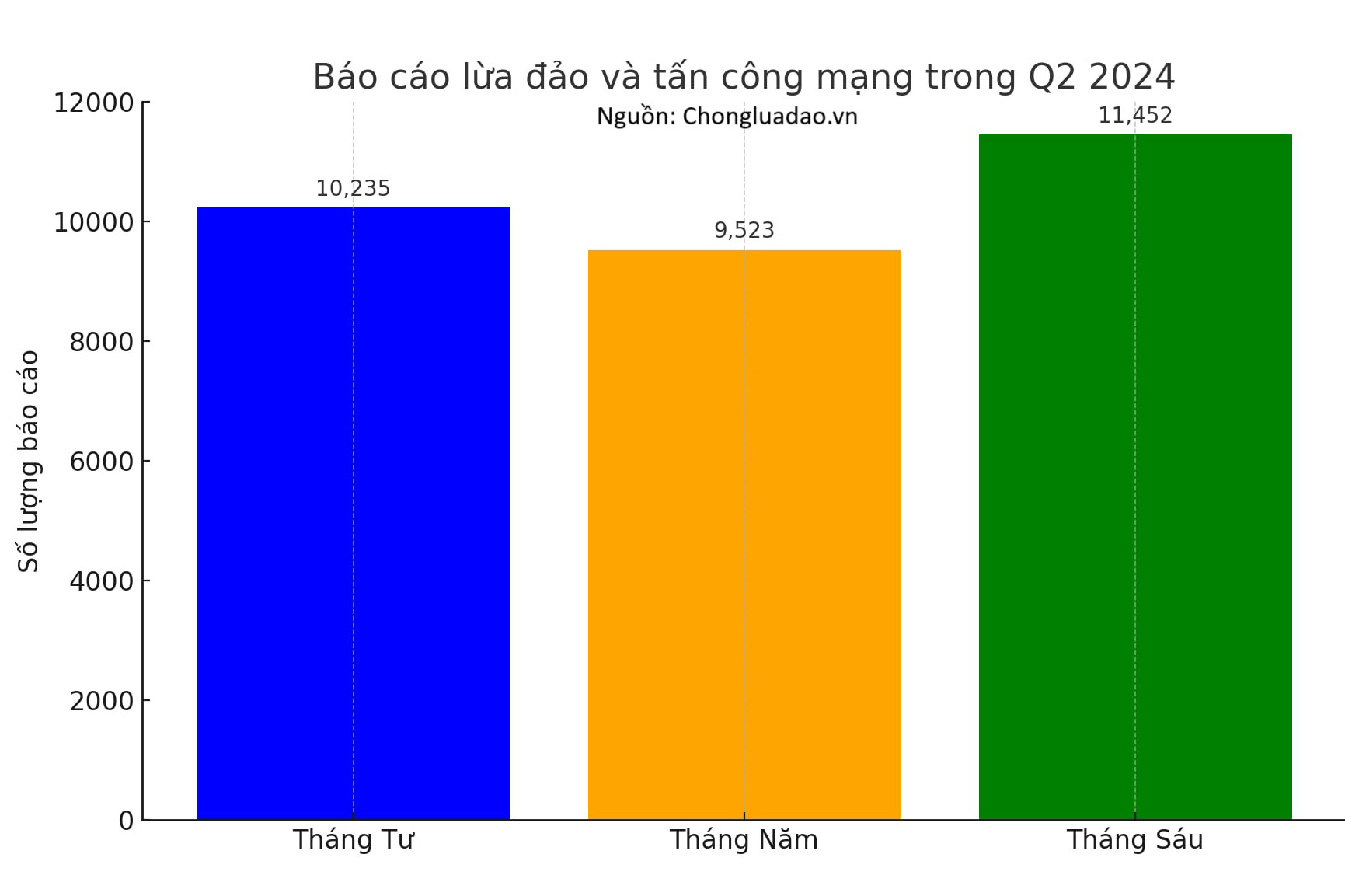 Cụ thể, đã có 10.235 báo cáo về các vụ lừa đảo và tấn công mạng được dự án Chống lừa đảo thống kê trong tháng 4 của năm nay. Con số này là 9.523 vụ ở tháng 5 và 11.452 vụ trong tháng 6/2024.