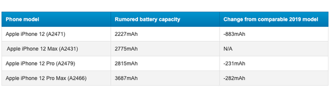 Gần hai tuần trước, My Smart Price tiết lộ thông tin về ba kích cỡ màn hình iPhone 12 khác nhau. Một hồ sơ gửi cho cơ quan quản lý SafetyKorea tiết lộ sẽ có ít nhất một thiết bị iPhone mới có dung lượng pin 2.775 mAh. Hai model có cùng kích thước 6,1 inch (iPhone 12 Max, iPhone 12 Pro) ban đầu được dự đoán có thể dùng chung pin, nhưng tin rò rỉ sau đó cho thấy sẽ có một trong hai mẫu này, mang mã A2479 được trang bị thỏi pin lớn hơn 2.815 mAh.