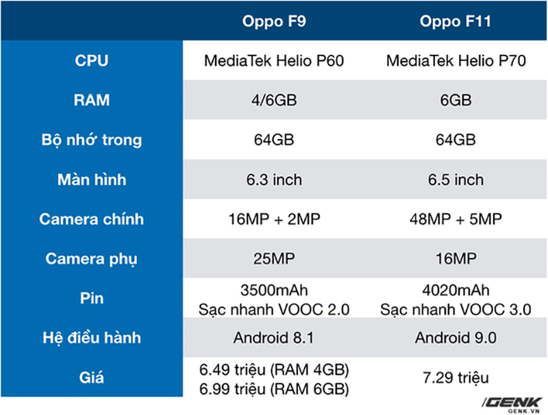 Trong khi đó, Oppo F11 có giá 7.29 triệu, tức là chỉ hơn vài trăm nghìn. Tuy nhiên, đừng tiếc rẻ - vài trăm nghìn đó sẽ là vài trăm nghìn đáng giá nhất mà bạn từng bỏ ra, do Oppo F11 vượt trội hơn Oppo F9 về mọi mặt. Các bạn có thể tham khảo bảng so sánh dưới đây để thấy rõ điều này.