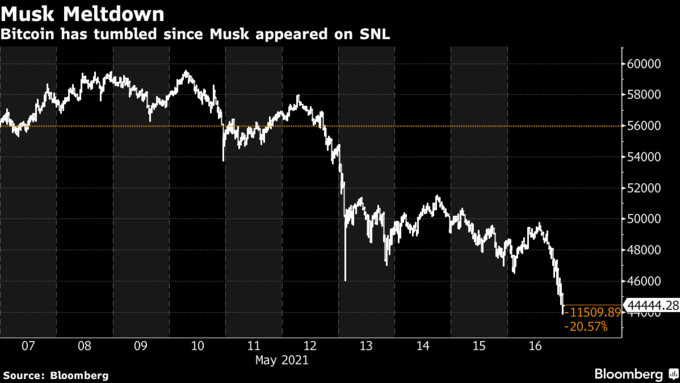 Ngay sau ngụ ý của tỷ phú Elon Musk, giá Bitcoin tiếp tục giảm mạnh. Theo dữ liệu từ CoinDesk, sáng 17/5, Bitcoin giảm 8% với mức thấp kỷ lục là 43.983 USD. Hiện tại, Bitcoin được giao dịch quanh mốc 46.000 USD, giảm gần 4.000 USD so với hôm thứ 6 (14/5).