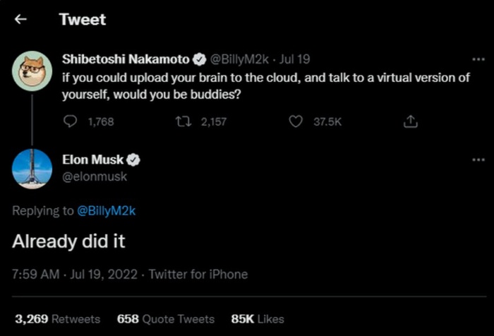 Trong một Tweet được chia sẻ trên Twitter, nhà sáng lập của DogeCoin, Billy Markus hỏi: "Nếu ông có thể tải dữ liệu não bộ lên đám mây để cùng trò chuyện, liệu hai người có thể trở thành bạn bè không", Elon Musk đã trả lời ngắn gọn: "Đã làm rồi".